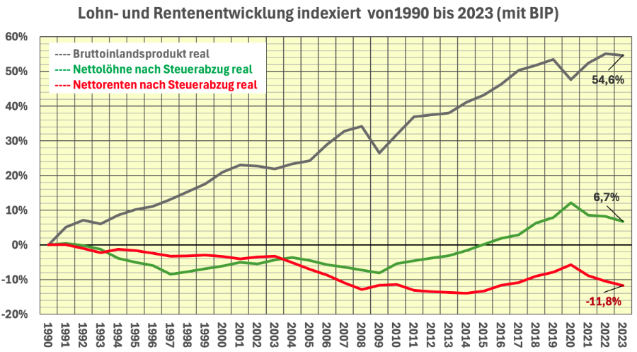 Das inflationsbereinigte Bruttoinlandsprodukt, grob gesprochen das reale Wirtschaftswachstum, ist in den vergangenen 33 Jahren um 55 % gestiegen. Im krassen Gegensatz dazu, hatten die realen Nettolöhne einen jämmerlichen Zuwachs um 7 %. Erst im Jahr 2015, also nach 25 Jahren, erreichte die reale Kaufkraft der Durchschnittslöhne den Wert von 1990. Noch drastischer wurde die Kaufkraft der Renten um 12 % in den Keller gedrückt. In dem langen Zeitraum von 3 ½ Jahrzehnten haben die Renten nie mehr die Höhe der noch 1990 vorhandenen Kaufkraft erreicht. Die Renten erlitten regelrecht eine Schwindsucht. Die Löhne waren noch bis 2003 die entscheidende Bezugsgröße für die Rentenhöhe. Ab 2004 wurden die Renten zunehmend von der Lohnentwicklung abgekoppelt. Das alles war politisch so gewollt.