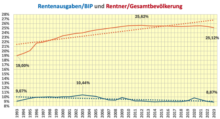 Der Anteil der Rentnerinnen und Rentner (Altersrenten, Erwerbsminderungsrenten, Witwen-/Witwerrenten) an der Gesamtbevölkerung wuchs in den letzten 30 Jahren von 19 Prozent auf 25 Prozent. Das war ein Zuwachs von 33 Prozent. Die Ausgaben der Rentenversicherung für diese Rentner ist jedoch von 9,1 Prozent auf 8,9 Prozent des BIP gesunken. Dass die Ausgaben 2003 noch 10,4 Prozent des BIP betrugen und seitdem um gewaltige 1,5 Prozentpunkte gesenkt wurden (also um 15 Prozent), ist Ergebnis der „wahnsinnigen“ Rentensenkungspolitik der Agenda 2010. Zu Berücksichtigen ist auch, dass die angeblich hohen Beträge ja verwendet werden, um 21 Millionen Menschen zu versorgen. Immerhin ein Viertel der Bevölkerung.