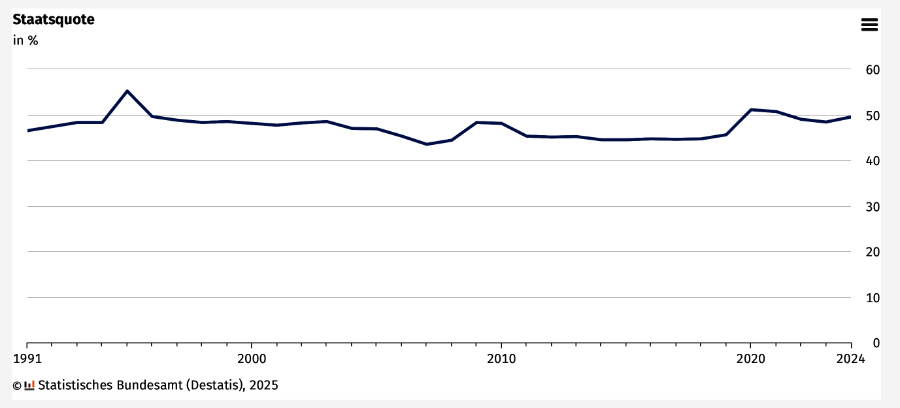Über den langen Zeitrahmen von 35 Jahren hat sich die Staatsquote zwischen 45 und 50 Prozent bewegt. Deutschlands Untergang droht jetzt, weil sich die Staatsquote wieder in Richtung 50 Prozent bewegt. Die Spitzenökonomen haben sich Spitzenpositionen verdient im Verbreiten von Alarmismus und Desinformation.